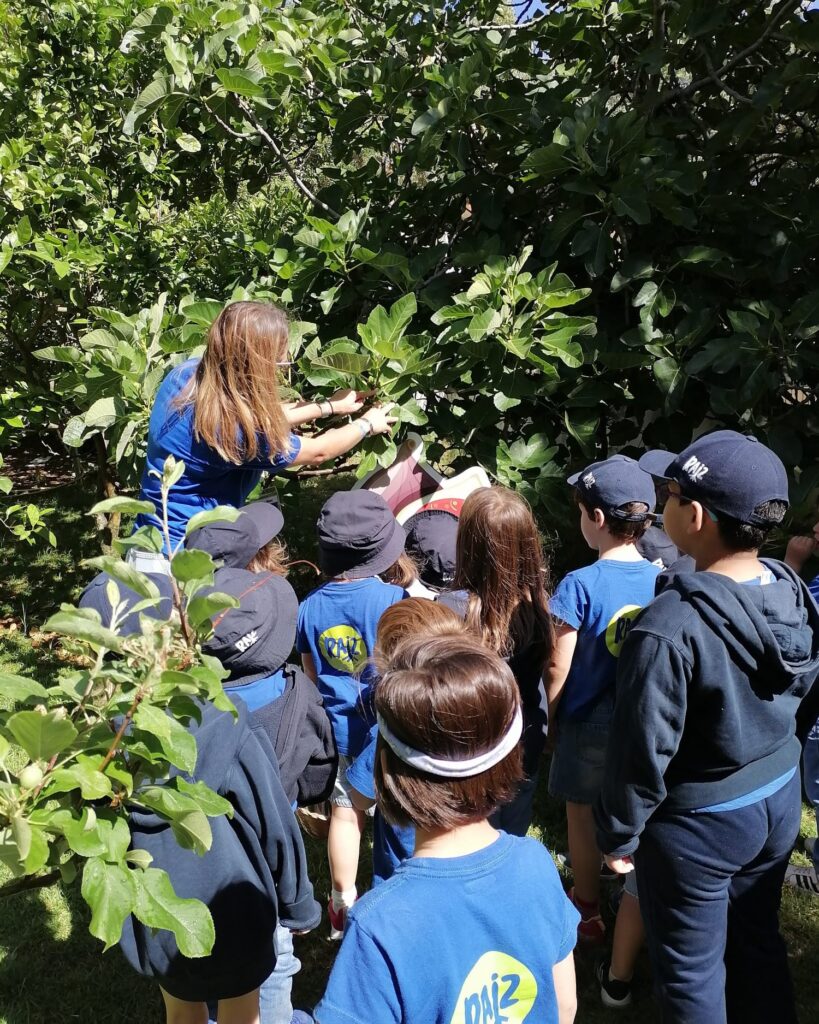 Depois fomos ao pomar conhecer as árvores de fruta. Para além de ficarmos a saber os seus nomes, ficámos a conhecer algumas caraterísticas sobre os seus frutos e estratégias para afugentar os bichos e pássaros do pomar. Apanhámos, também, amoras da amoreira para comer.